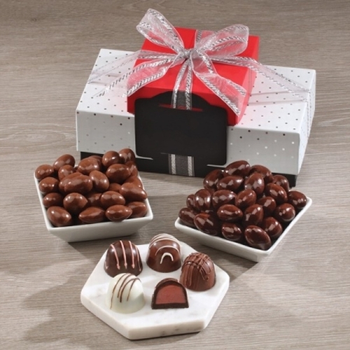 This contemporary gift includes our world-famous milk and dark chocolate almonds. Each base is topped with a box filled with a lavish assortment of gourmet truffles, then tied with decorative ribbon and a tag bearing your imprint. When they open this gift, they'll be treated to a memorable experience that shows just how much you appreciate all they do. Made in USA. Contents: Milk Chocolate Almonds, 5 oz., Dark Chocolate Almonds, 5 oz., 4 Assorted Truffles.