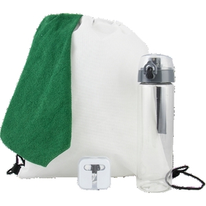 >Kit includes: DSBP - drawstring backpack, 1518HC - hemmed color towel, EARBUDDY - earbuds in a case, TREKSPORT25 - 25 oz bottle with trekker lid