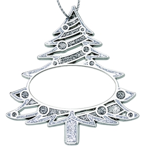 Glitter Christmas Tree Holiday Ornament. Die cast with intricate pierced details. Includes a full color imprint w/poly dome. Includes silver metallic hanging cord for Christmas tree decoration. Includes decorative gift envelope for easy holiday giving. Deluxe Velour Gift Pouch also available. Ornaments measure approximately 2.75" tall. Production time: 6 working days standard, 4 day rush available.