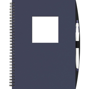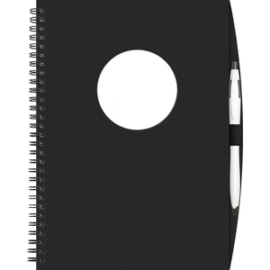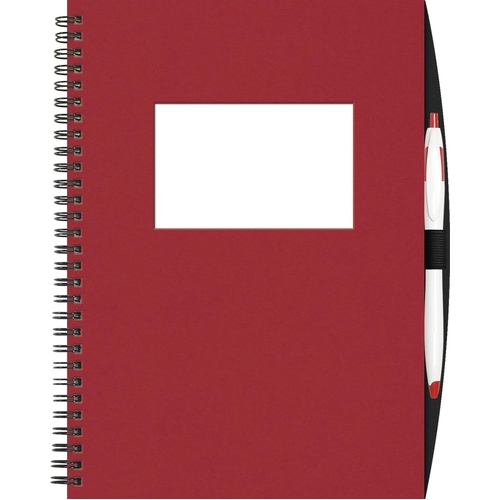Front cover available in Blue Red or Black heavy paperboard with PenPort and matching Cougar Pen. Includes stock die-cut window (choose from square rectangle or circle) and full-color 1-sided insert on Gloss White Cover stock (showing through window). 70 sheets of 50 lined filler. Black wire binding.