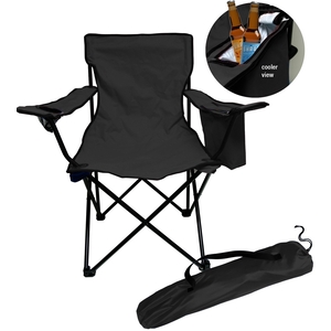 Portable camping/sport chair with a built in cooler in the arm rest. 600 denier nylon. Comes with carry case. Pop up design with sturdy aluminum frame. Comes with built in cup holder. Uses: Sporting Events,Beach,Camping,Outdoor,Sport,Tailgating.